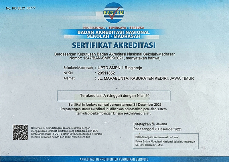 SMP Negeri 1 Ringinrejo mendapatkan nilai akreditasi A (Unggul)