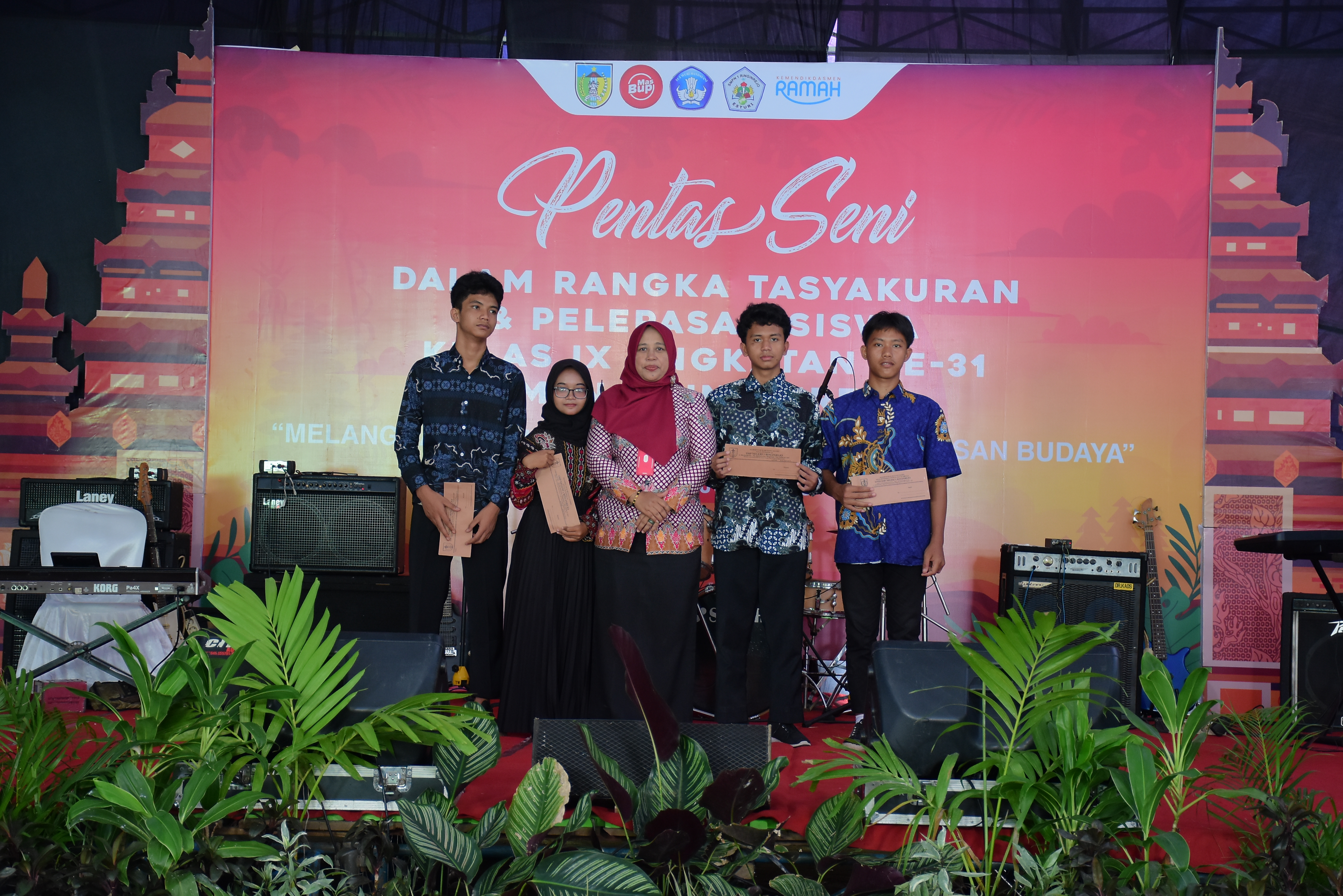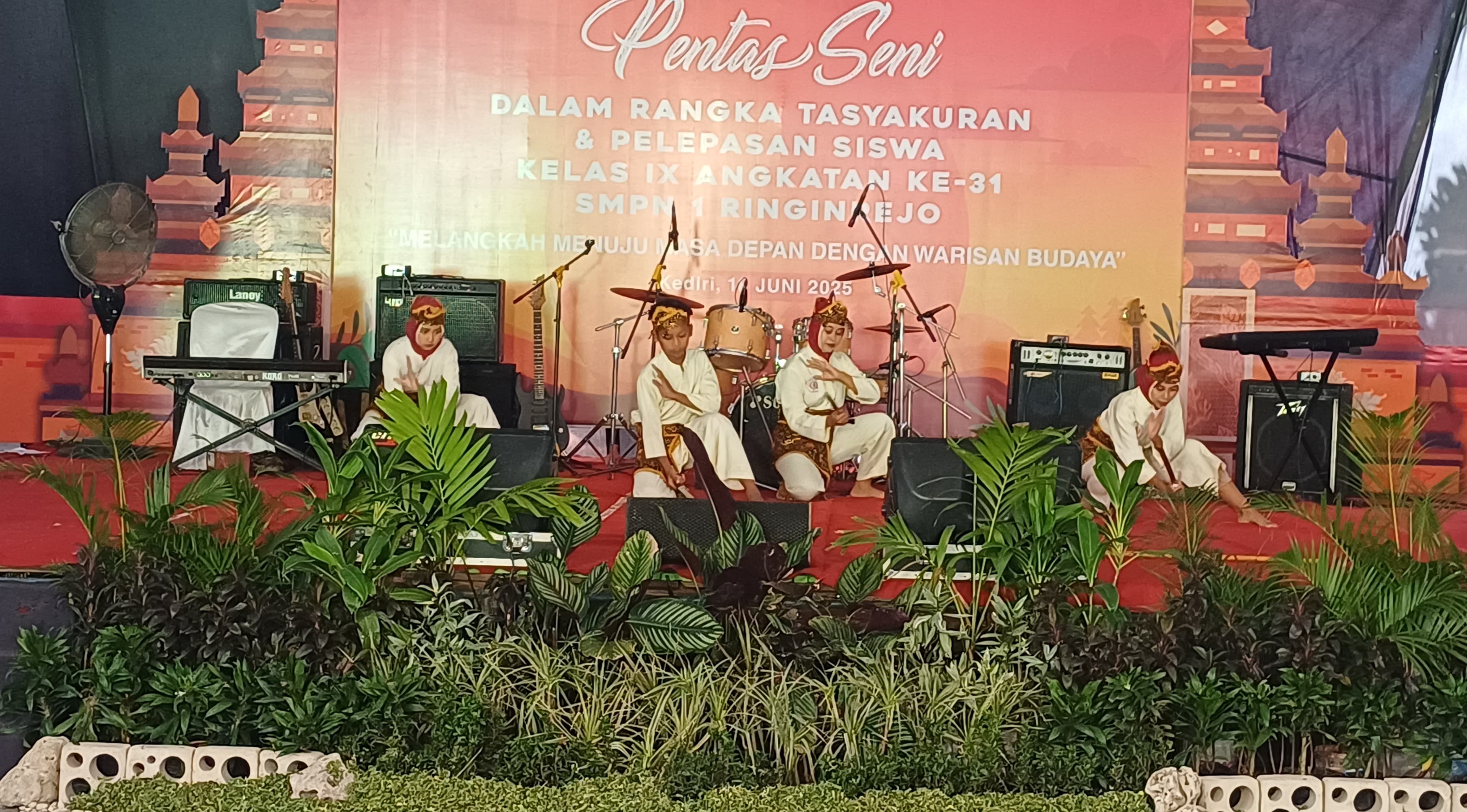 Dalam rangka pelepasan siswa kelas IX tahun pelajaran 2024/2025, SMPN 1 Ringinrejo menggelar acara Gebyar Seni yang penuh semangat dan makna. Acara ini diikuti oleh seluruh siswa kelas IX bersama orang tua dan dihadiri oleh jajaran guru serta tenaga kependidikan. Selain menjadi ajang unjuk bakat seni siswa, kegiatan ini juga diisi dengan momen berbagi melalui pemberian bantuan uang tunai kepada siswa yang membutuhkan untuk melanjutkan pendidikan ke jenjang berikutnya.